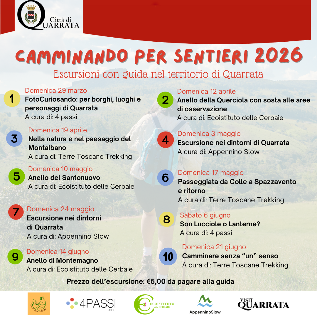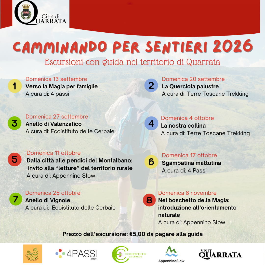 Torna anche quest'anno "Camminando per sentieri 2026" un ciclo di escursioni a passo lento per esplorare il territorio di Quarrata, scoprire i suoi colori e sapori e ammirare le sue bellezze naturali e paesaggistiche. L’iniziativa è promossa dal Comune di Quarrata – Ufficio Turismo e Promozione del territorio in collaborazione con Appennino Slow, Ecoistituto delle Cerbaie, 4.Passi one e Terre Toscane Trekking.